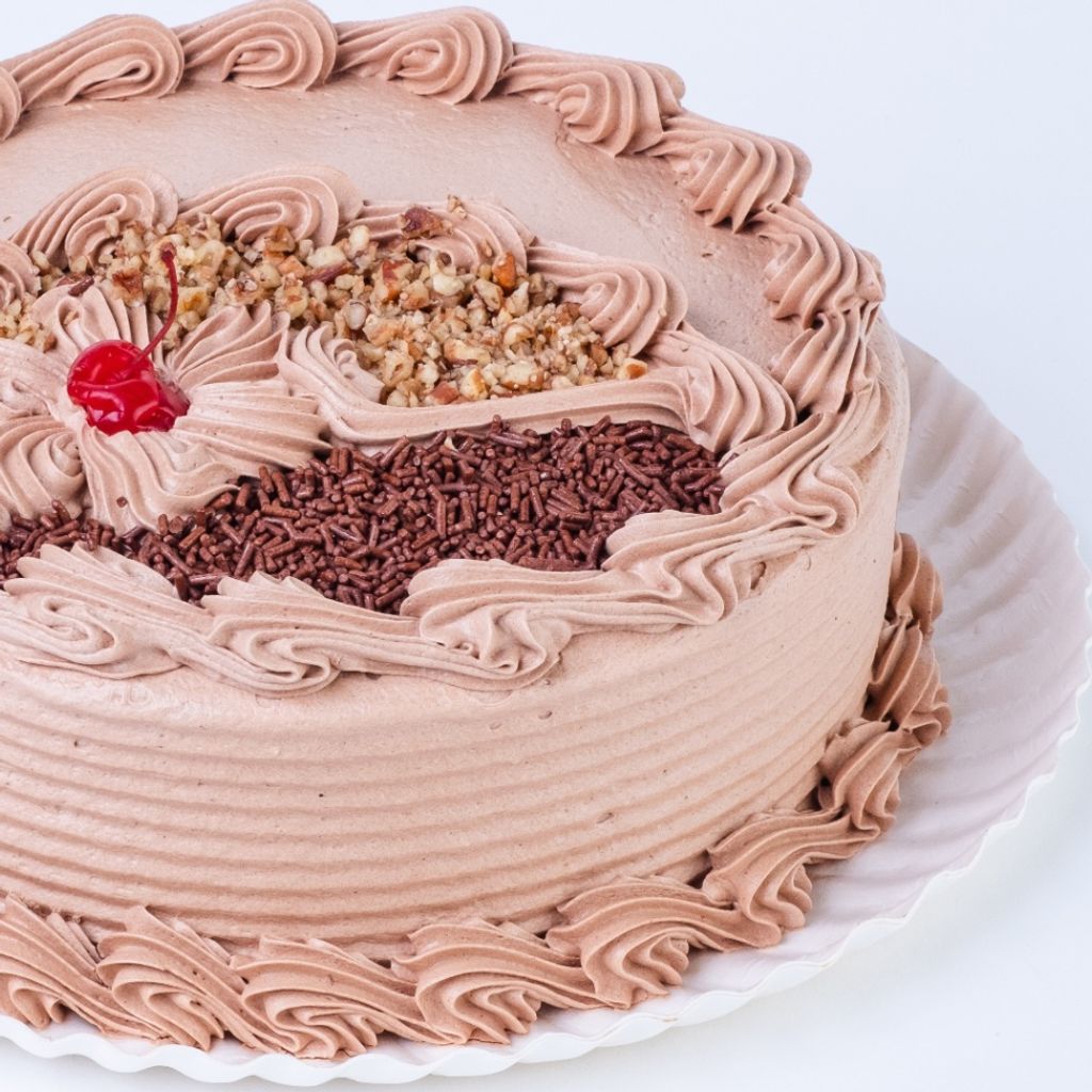 (30 personas) Un delicioso pan suave de chocolate y nuez, relleno y cubierto de betún de moka, (cocoa, chocolate, margarina y vainilla) espléndidamente detallado con nuez y granillo sabor chocolate.
